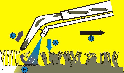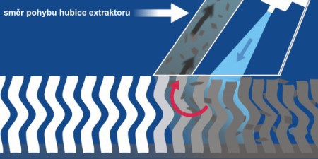 V tomto případě je metoda mokrého čištění za pomocí extrakčního přístroje velmi účinná. Jak ovšem celý proces funguje? Na suchý povrch, který je předem vyčištěn od hrubých nečistot, je nanesena vrstva směsi vody s čisticím prostředkem (A). Čistící hlavice při pohybu nanáší vodu s čistící směsí, rovněž tře o povrch koberce a zvyšuje tak působení čistícího roztoku (B). V okamžiku kdy je vysávací oblast nad oblastí vlhkou, je celková nečistota vysáta do extrakčního zařízení (C).